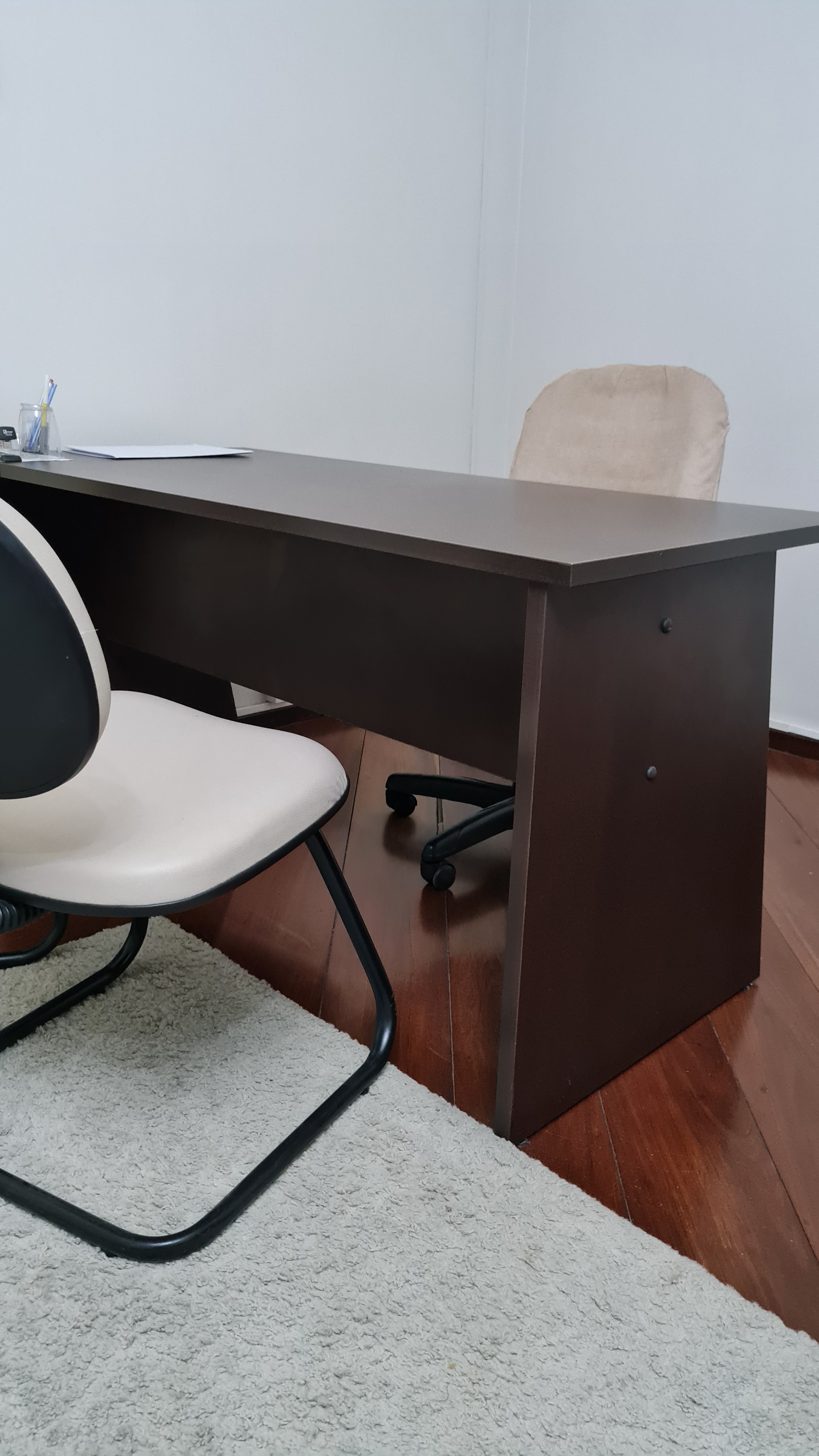Atenda seus clientes aqui. A sala possui uma mesa de atendimento e três cadeiras.